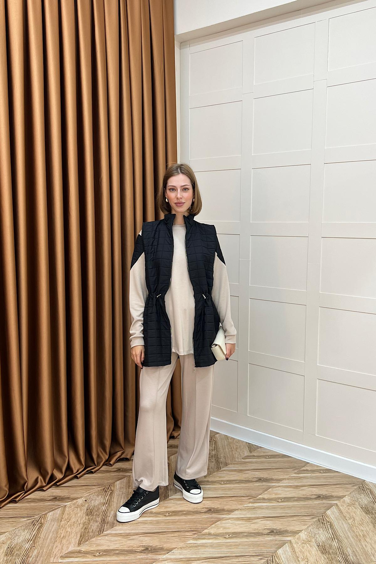 Üçlü takımdan oluşmaktadır: üst, alt ve kapitone dış parça. Ürünün dış kısmı kapitone kumaştandır, iç takım Ojo kumaştır. Kollarında kapitone detayı bulunmaktadır. Kapitone dış parça beli lastiklidir ve rahat bir kullanım sunar. Günlük kullanıma uygun, modern ve fonksiyonel bir tasarıma sahiptir.