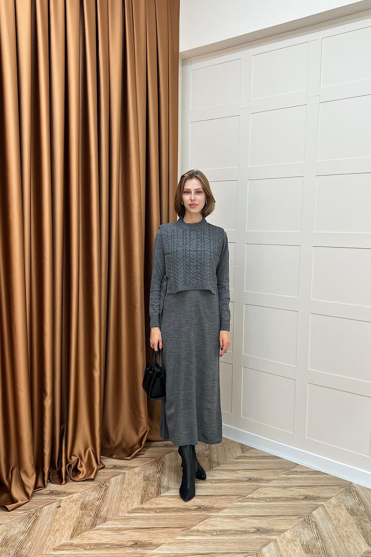 İnce triko kumaştan üretilmiştir. İki parçadan oluşmaktadır: örgü detaylı crop ve iç elbise. Crop kısmında yanlardan kuşak detayı mevcuttur. İç göstermez ve tiftiklenme yapmaz Günlük ve şık kombinler için uygundur.
