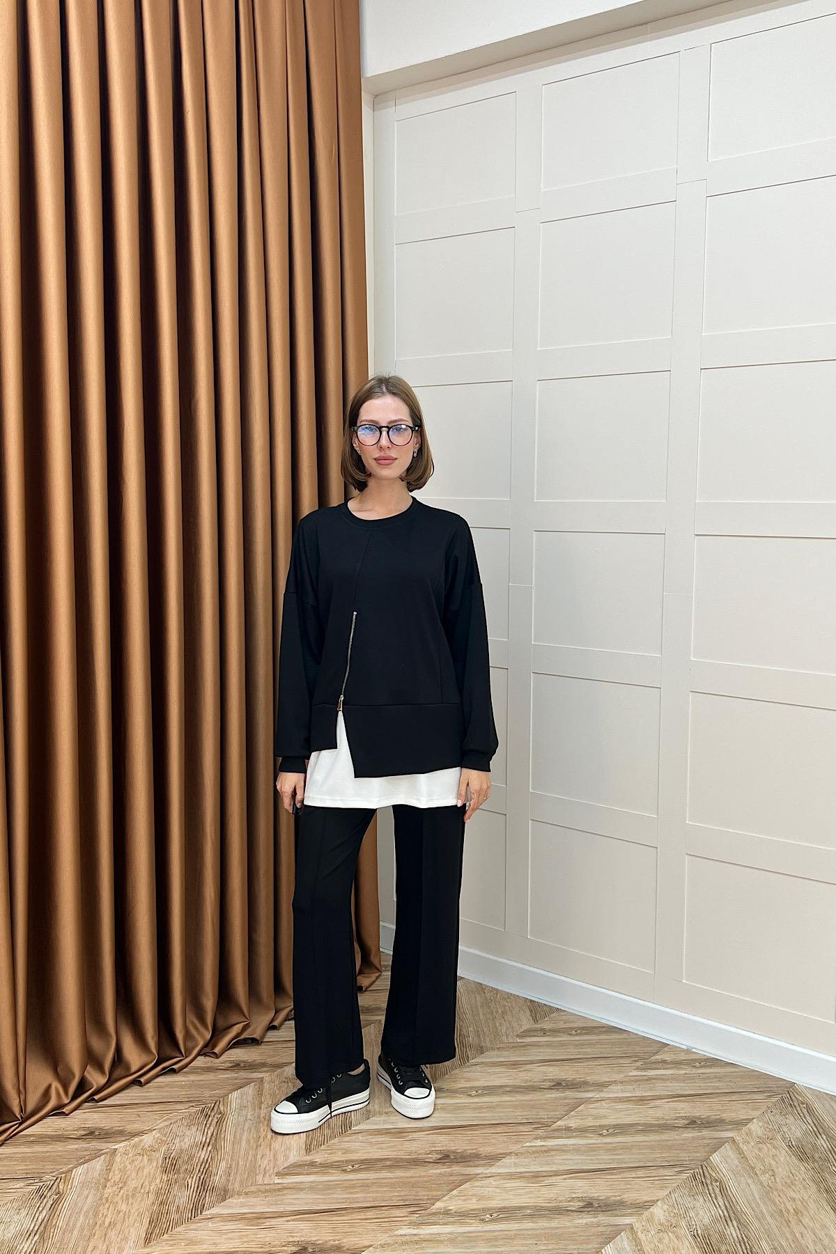 İkili parçadan oluşmaktadır: üst ve pantolon.Modal kumaşı ile rahat ve dökümlü bir yapı sunar.Üst formunda fermuar detayı ve iç kısmında beyaz detay mevcuttur.Pantolon beli lastiklidir, konforlu ve kolay kullanım sağlar.Diz izi yapmaz, tiftiklenme oluşmaz; uzun ömürlü ve konforlu kullanım sunar.Günlük ve özel kombinlerde şıklıkla tercih edilebilir.