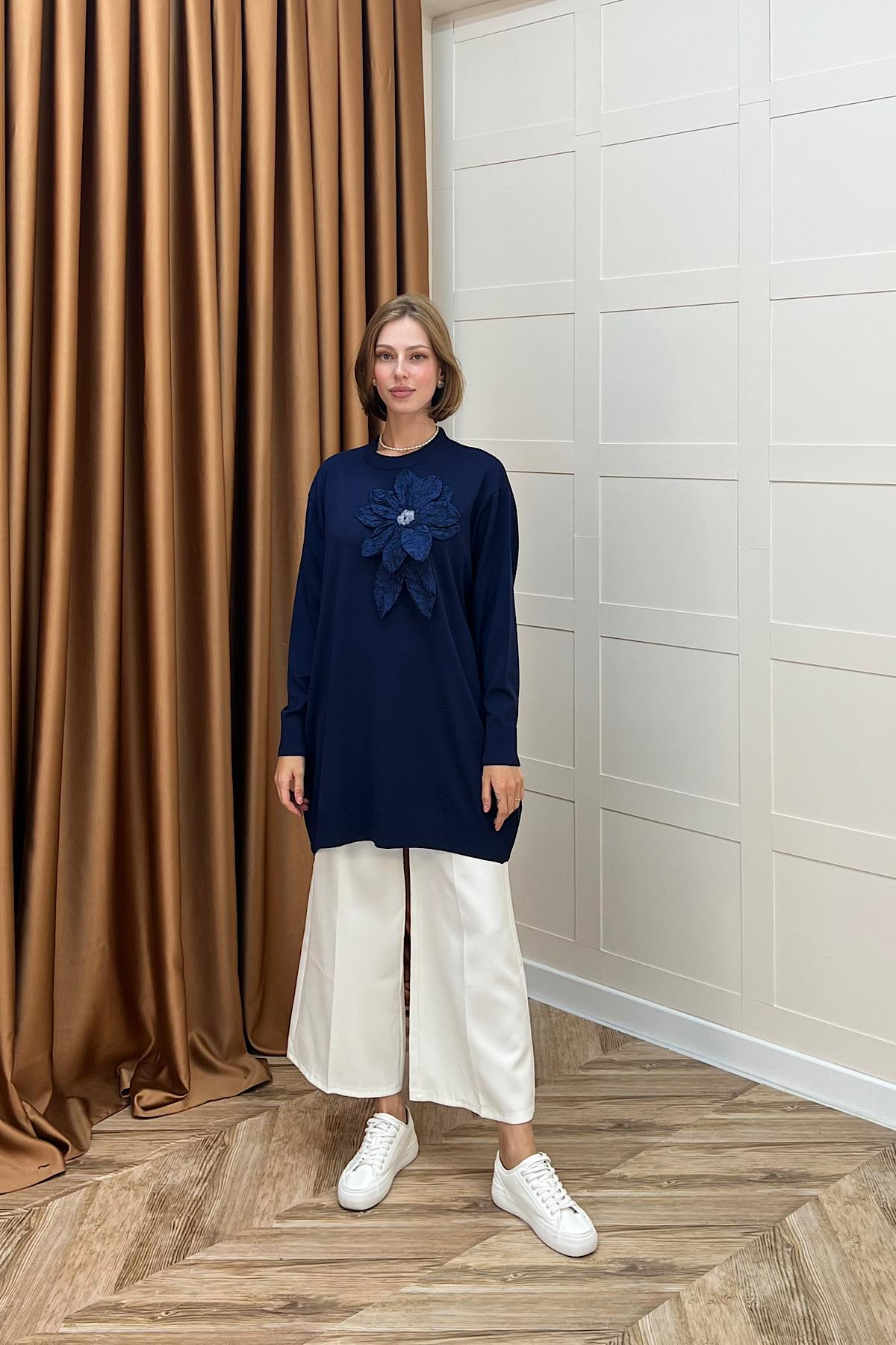 Merserize Çiçekli Triko Tunik Lacivert (2550-LACIVERT)