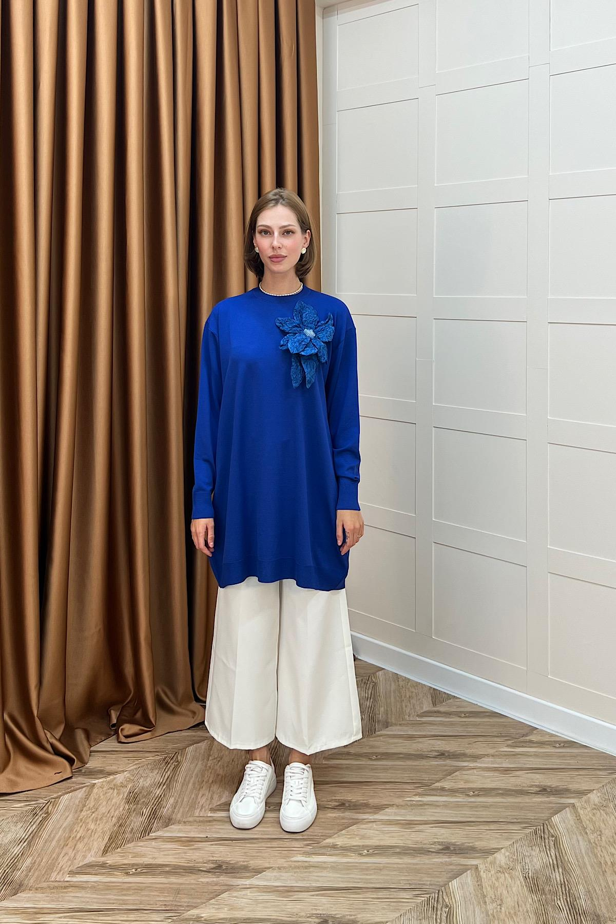 Merserize Çiçekli Triko Tunik Saks (2550-SAKS)