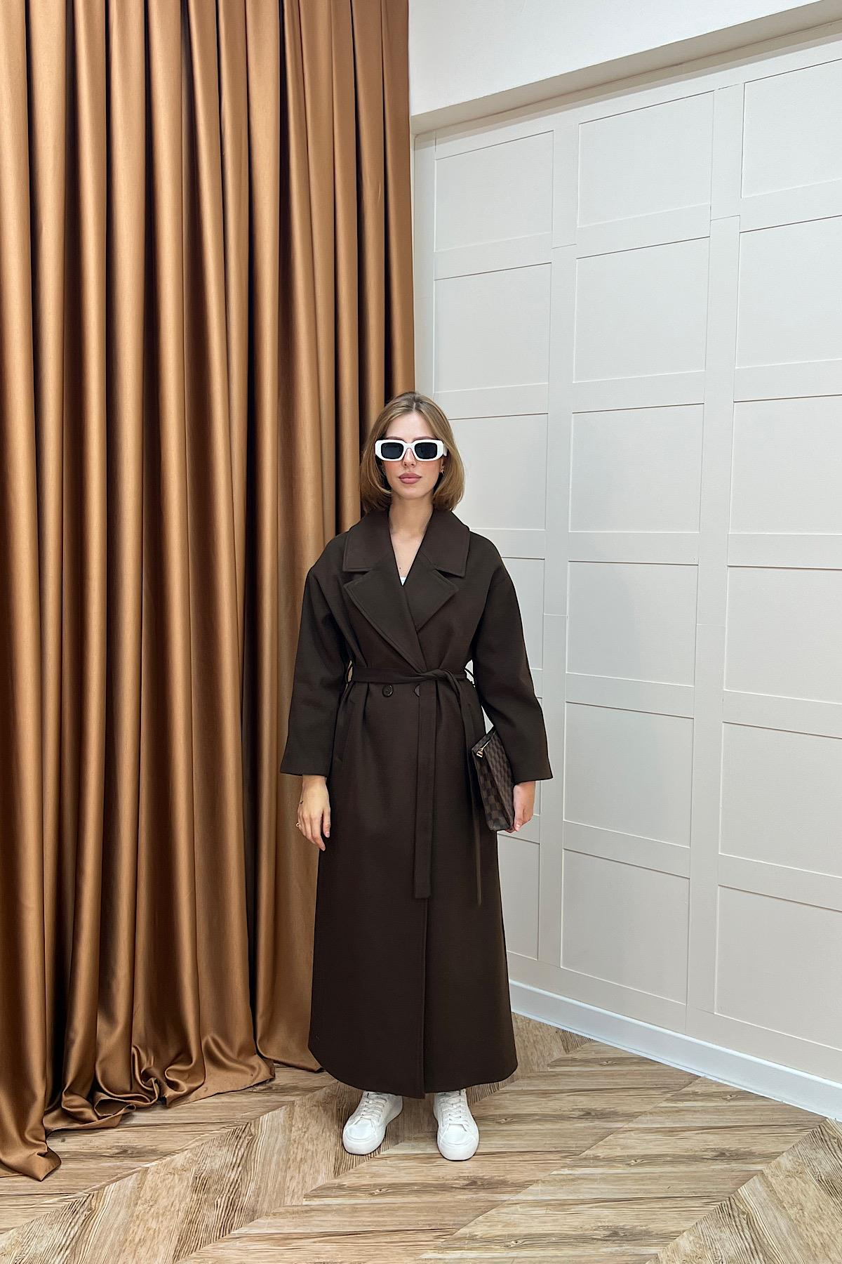 Retro Premium Kumaş Uzun Kaşe Kaban Kahverengi (5509-KAHVERENGI)