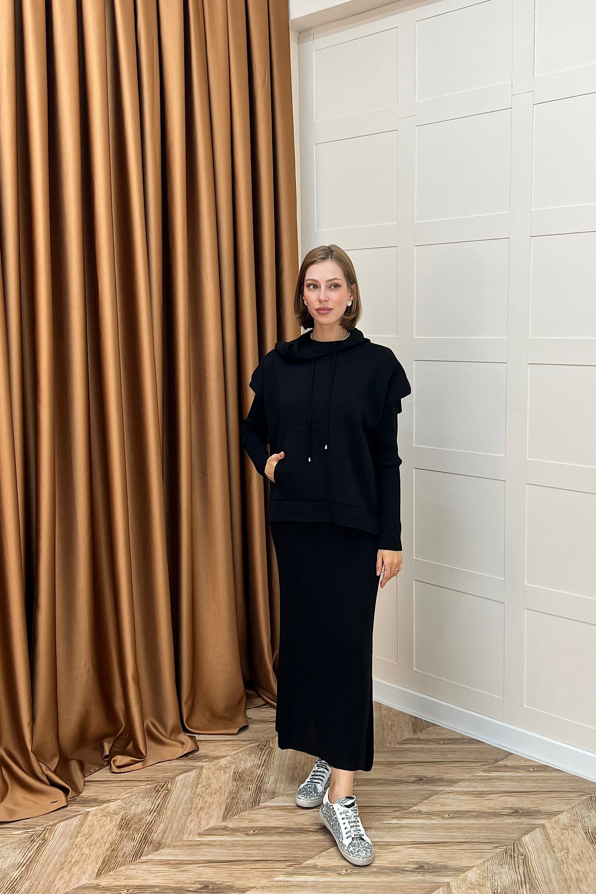 Üst Kapüşonlu İkili Triko Elbise Siyah (25290-SIYAH)