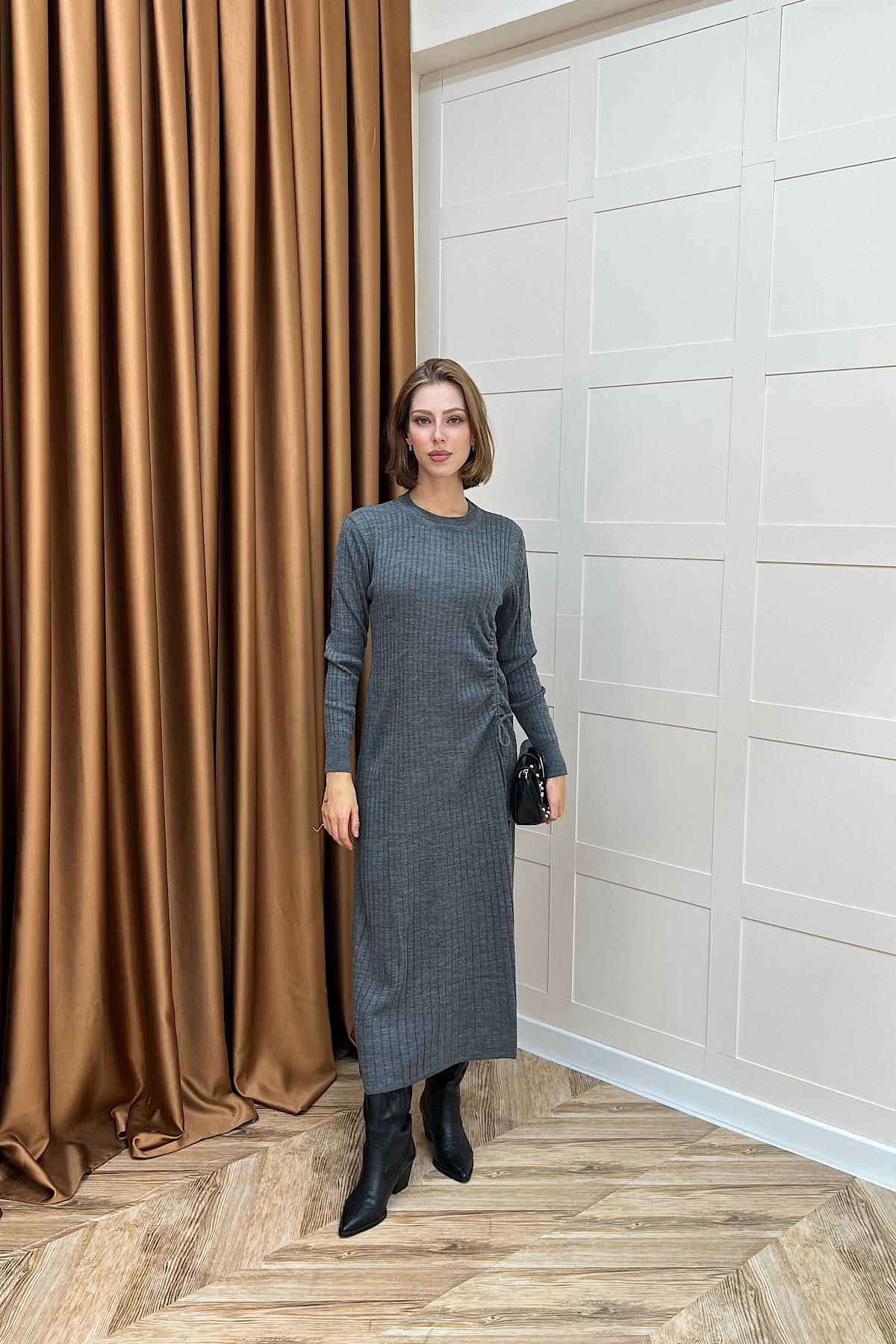 Yandan Büzgülü Triko Elbise Gri (24870-GRI)