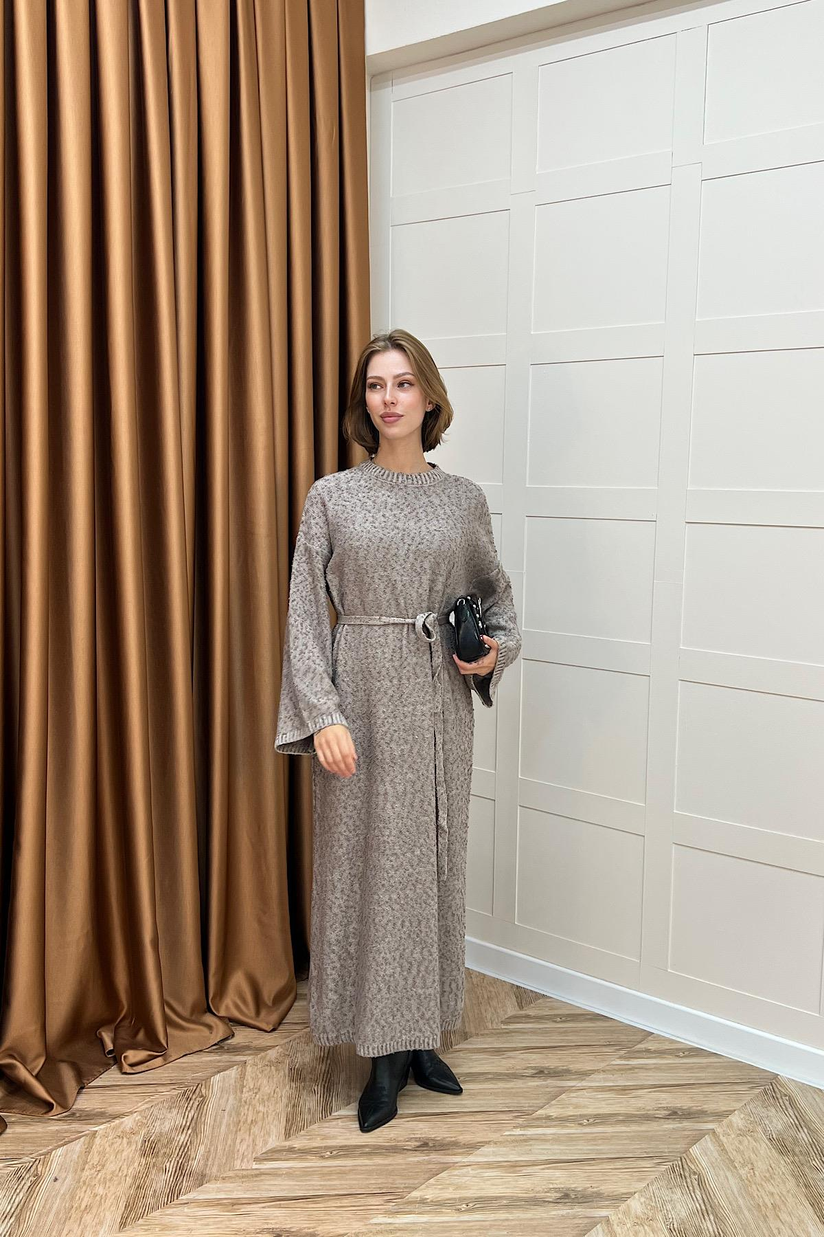 Yumoş Sim Karışımlı Salaş Triko Elbise Vizon